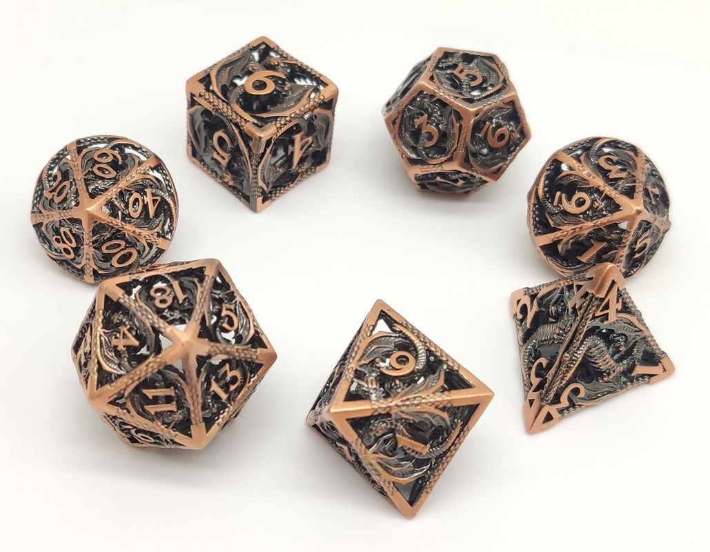 ست کامل هفت تاس چند وجهی لبه تیز ریخته شده، صیقلی و سمباده کاری شده با ظرافت فوق العاده.تس لبه تیز دست ساز، سمباده دستی، صیقلی، هفت تاس چند وجهی. دست ساز و حکاکی شده با دست.برای استفاده در سینی های تاس توصیه می شود.